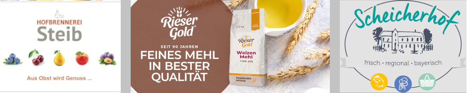Eier, Spätzle, Ei-Likör und Eis vom Scheicherhof, Rehling Milch vom Sauer-Hof, Stepperg Honig vom Imker Erich Modlmair, Wächtering Süßes von der Bonbonfabrik Eduard Edel, Donauwörth Liköre und Brände von der Hofbrennerei Steib, Treidelheim |